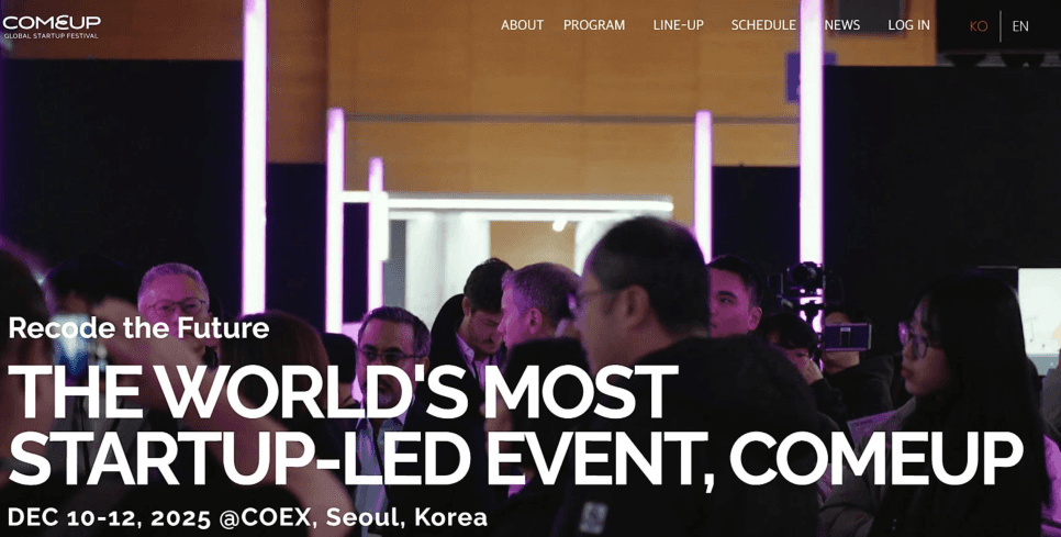 COMEUP 2025는 중소벤처기업부가 주최하는 글로벌 창업 행사로, 올해는 ‘Recode the Future(미래를 다시 쓰는 시간)’을 슬로건으로 행사를 진행합니다.
