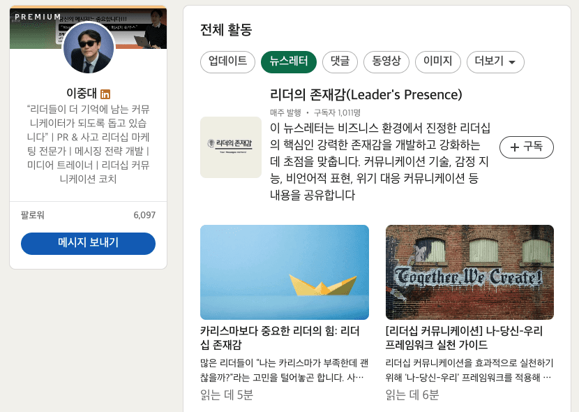 브런치나 블로그가 글 자체에 더 집중되는 공간이라면, 링크드인은 프로필과 콘텐츠가 함께 작동하는 채널이에요. 즉, 내가 어떤 사람인지, 어떤 주제를 오래 다뤄왔는지가 글과 함께 축적되기 때문에 개인의 전문성을 다시 포지셔닝하기에 굉장히 좋은 플랫폼이라고 생각합니다.