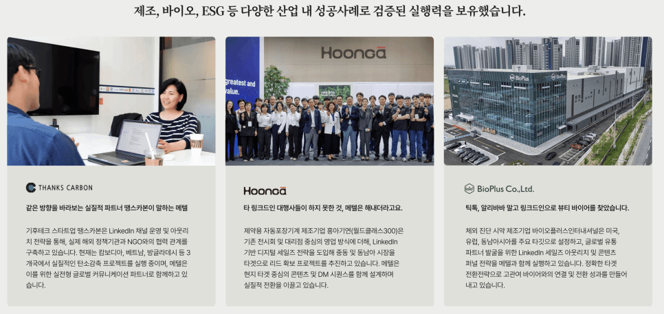 관심–대화–전환까지 한 흐름으로 설계합니다. 실제 케이스로 보면, 메텔과 함께 링크드인을 B2B영업으로 활용한 제조, 바이오, ESG 기업들은 해외 유통 파트너 발굴, 정부 기관 협업, 중동시장 진출 등 눈에 보이는 리드 전환 성과를 만들어내고 있습니다.