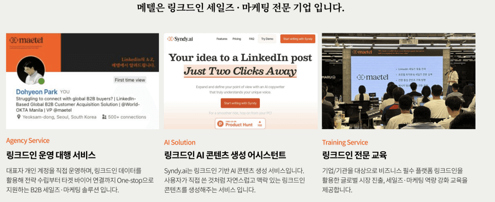 국내 최초로 대표자 개인 계정을 중심으로 전략 수립–콘텐츠 기획–타깃 아웃리치–리드 전환까지 모든 과정을 통합적으로 운영하는 데이터 기반 영업 솔루션을 제공합니다. 또한 링크드인 AI 콘텐츠 생성 서비스 ‘Syndy.ai’와 기업 맞춤형 링크드인 트레이닝 프로그램 그리고 더 나아가 링크드인 교육까지 함께 운영하며, 이미 50개 이상의 기업이 메텔과 함께 글로벌 시장에서 세일즈 성과를 만들어가고 있습니다.