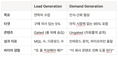 Demand Generation → 아직 구매 의사가 없는 바이어에게 인식과 신뢰를 먼저 만드는 것 (교육 콘텐츠, 사례 공유, 전문성 증명 등을 통해 바이어가 자연스럽게 우리 회사를 알게 되고, 필요할 때 가장 먼저 떠올리게 만드는 구조)
